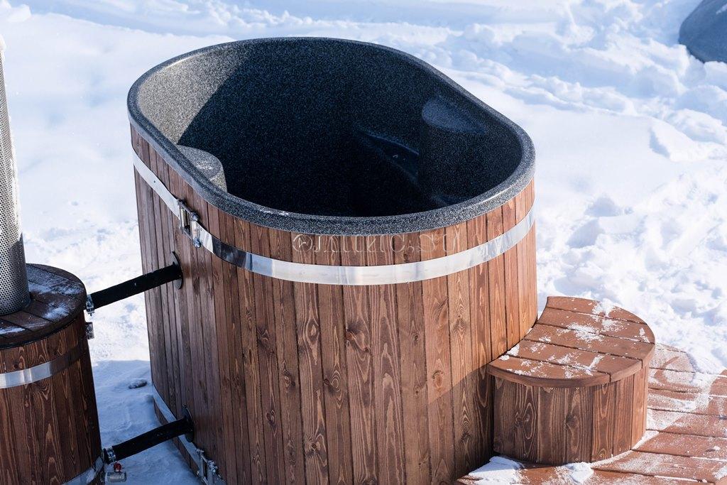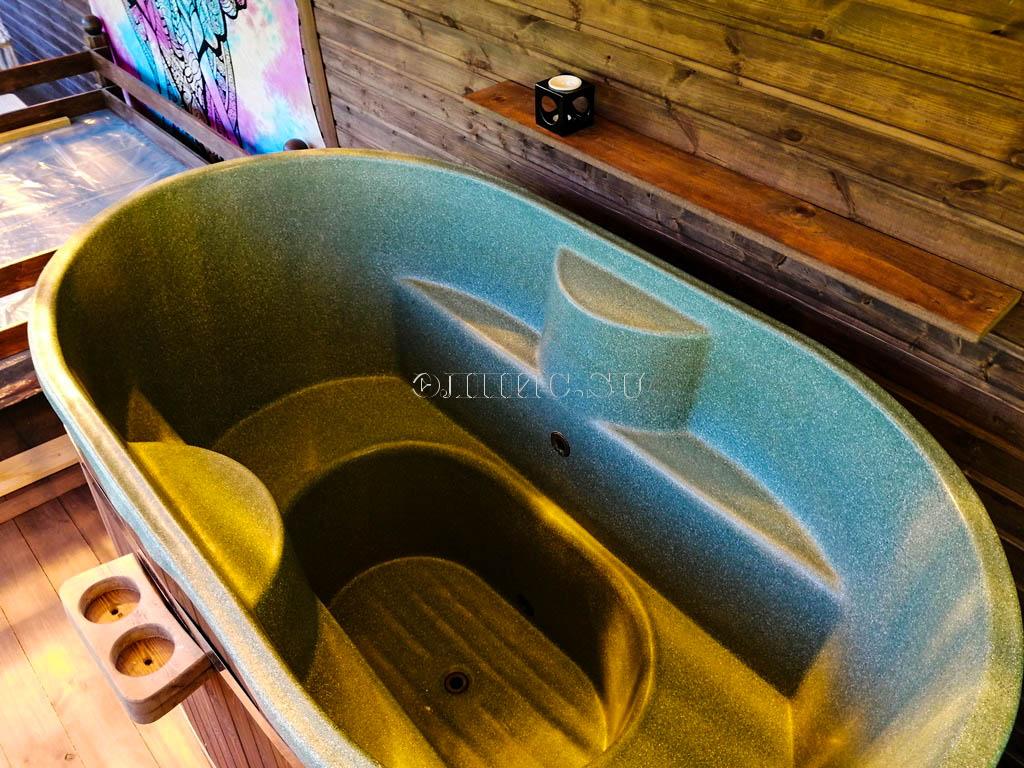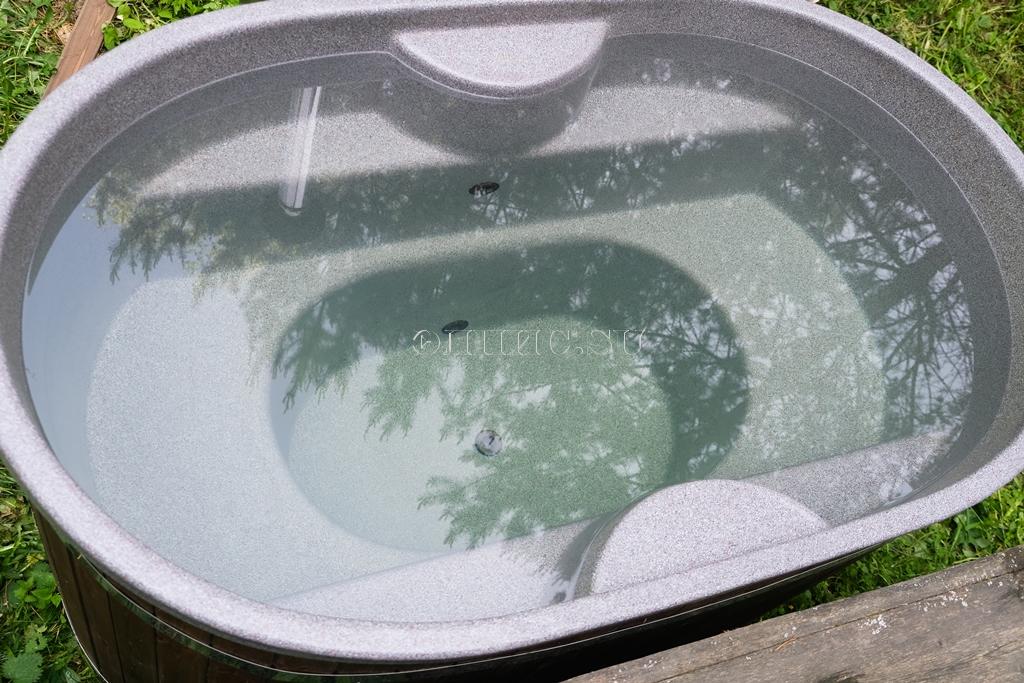 1. Деревянную купель (фасад - сосна, дно - лиственница) с цельнолитой пластиковой вставкой.