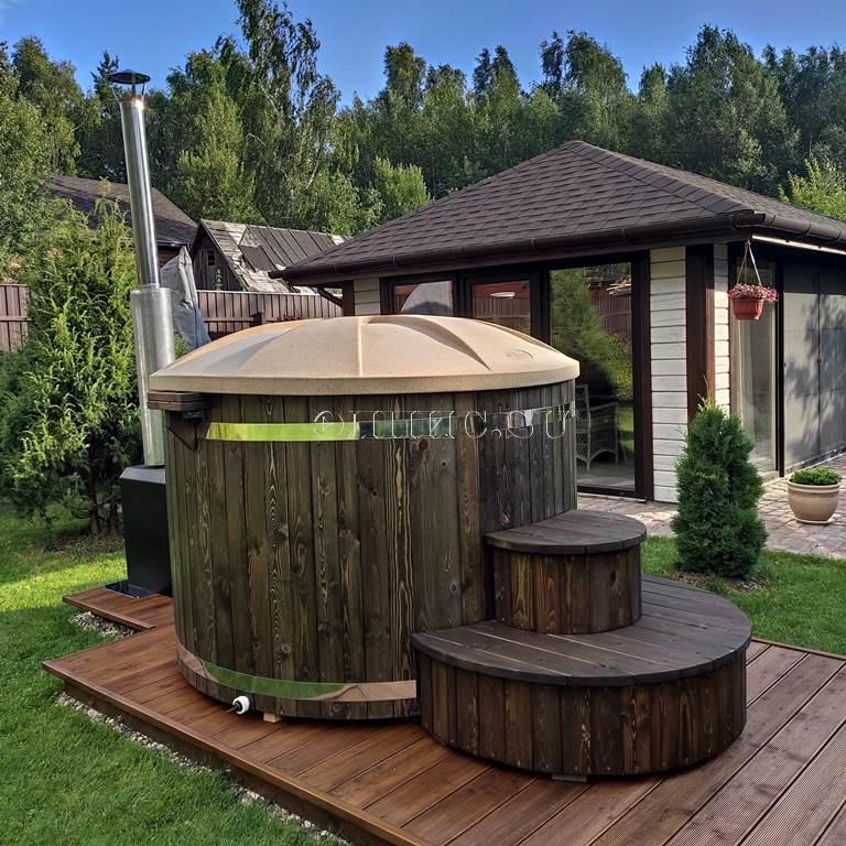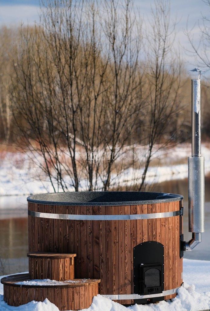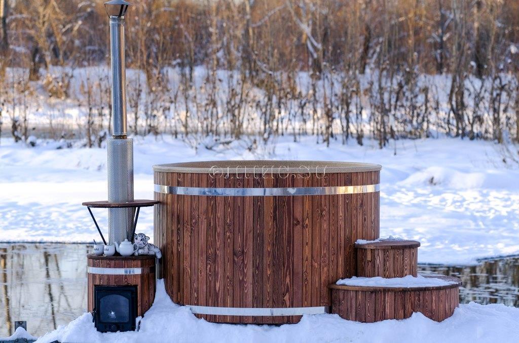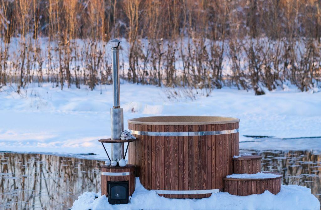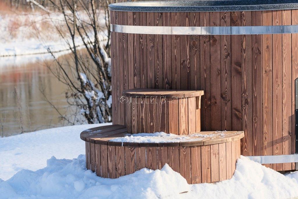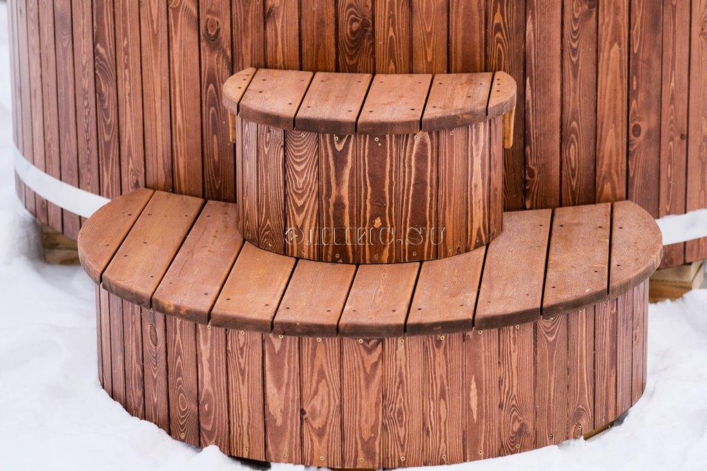 Подиум для купели из двух ступенек, шириной 1200 мм. высотой 650 мм. комбенированная сосна - лиственницы с защитным покрытием.
