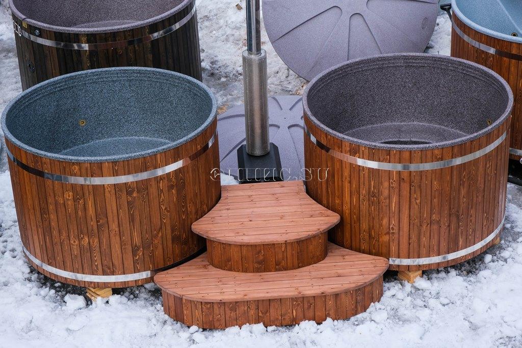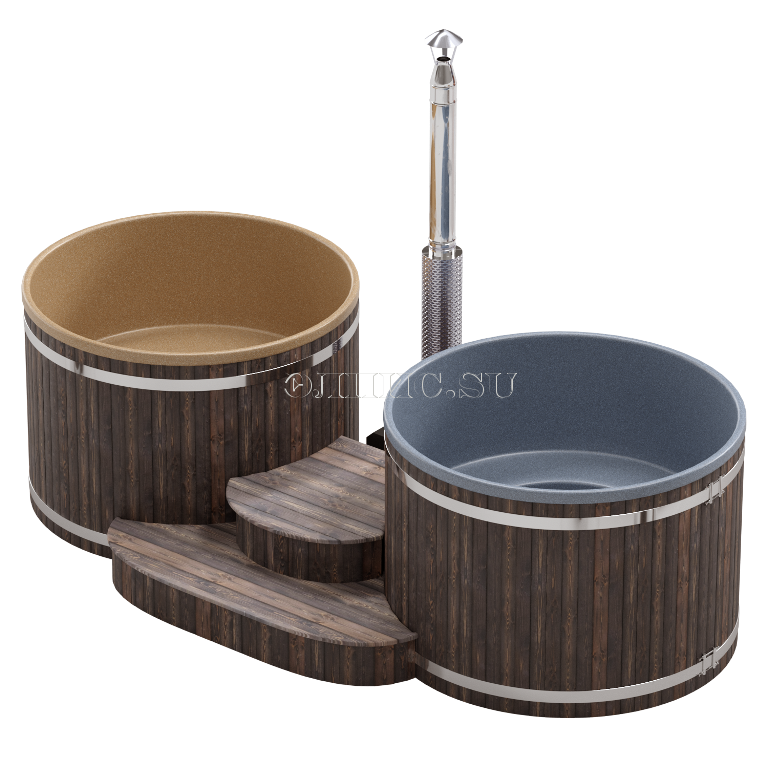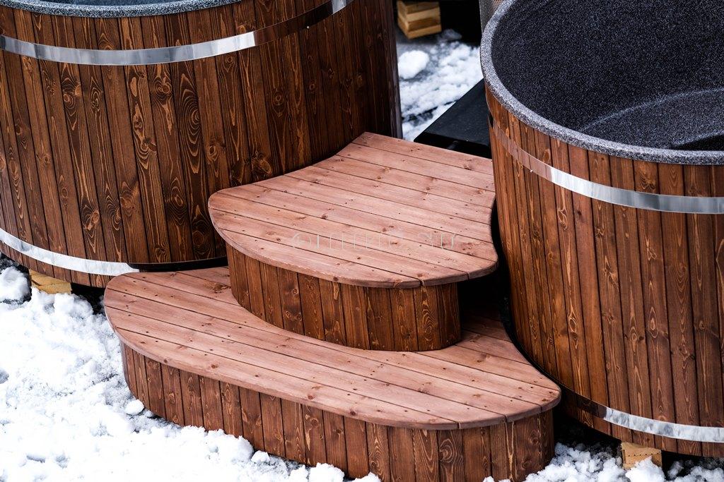 Подиум для двух купелей состоит из двух ступенек. Материал – лиственница + кедр + сосна с защитным покрытием.